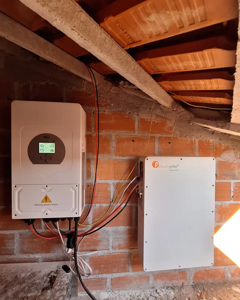 Projeto de Autoconsumo Residencial constituído por 5 painéis solares fotovoltaicos de 600wp da Aiko (Painel + EFICIÊNTE do mundo – TOP 1), inversor da Deye 3,6kw com bateria lítio felicitysolar 5kw.